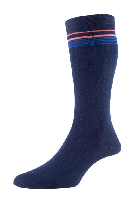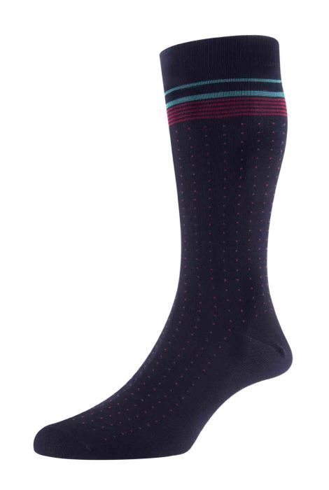 Barfield Cotton Lisle men's dress socks feature mini spots and stripes on a flat knit. The perfect addition to a classic tailored suit, these fil d'ecosse socks match brilliantly with the modern work wardrobe.