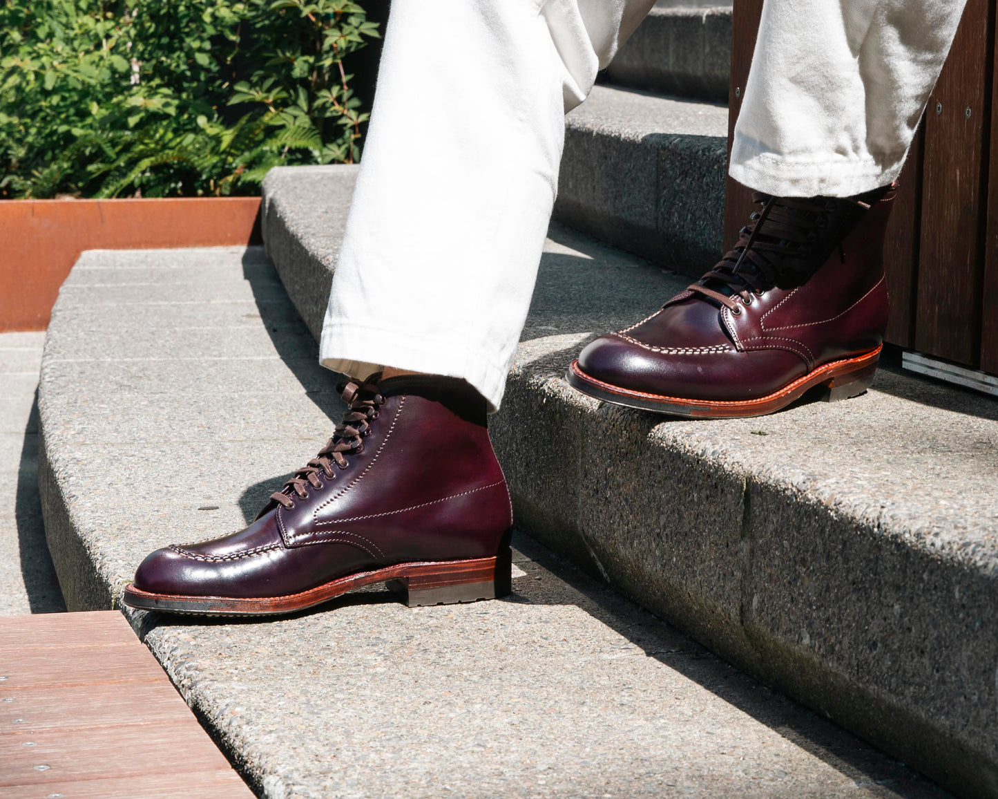The “Monarch” Handsewn Indy Boot is made exclusively for Brick + Mortar. Its considered approach as dressy-utilitarian exemplify our Pacific Northwest spin on the New England classy original. A vibrant burgundy Color 8 Shell Cordovan varies in hues from eggplant to dark burgundy, known for wardrobe versatility and adventure ready with a commando sole. A 270 flat welt paired with an antique welt and sole edge along with dark brown hardware keep this boot sleek, taking you from the elements to elegance.