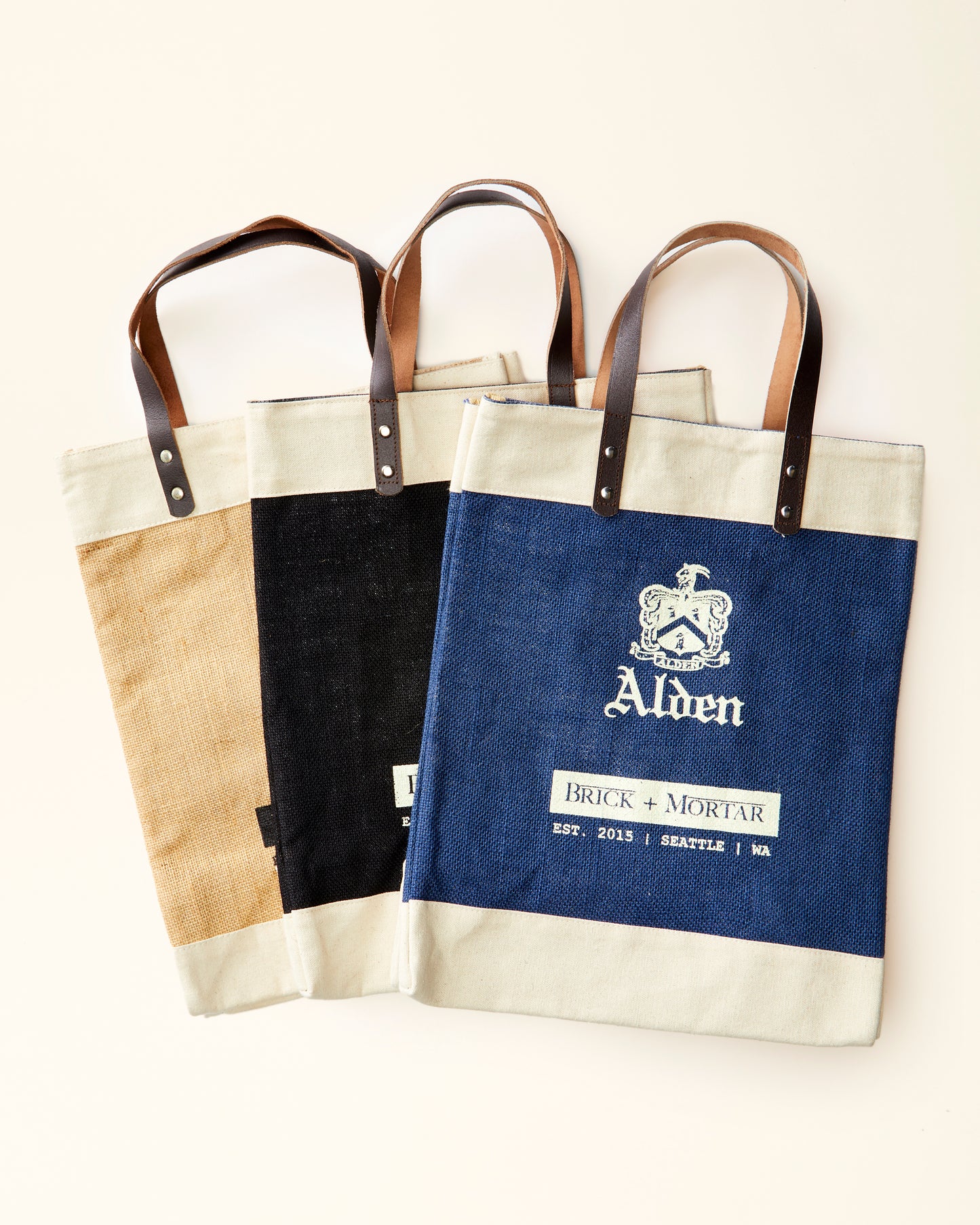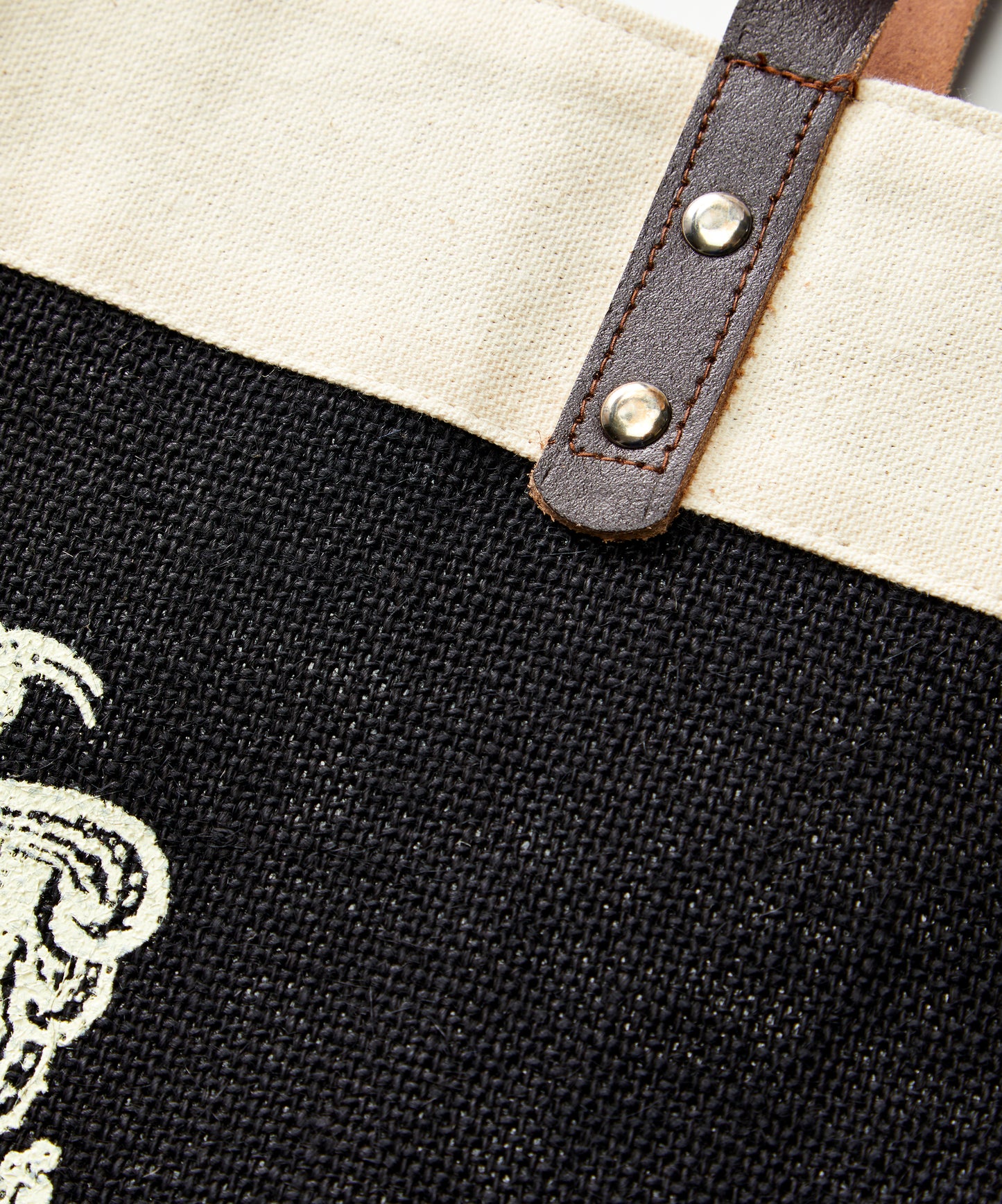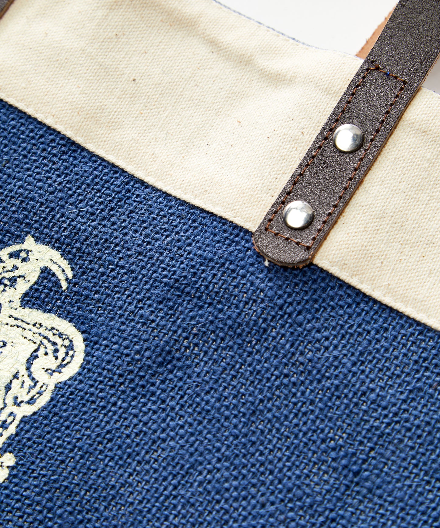 Made from 100% Jute which is strong, durable and protected with a waterproof liner. Built for the Seattle climate, you can drop this in a puddle and not worry about getting what's inside wet. Sturdy leather handles are stitched and riveted in order to bare a lot of weight and not break down. A large compartment means it can be perfect for your daily necessities but also becomes a perfect travel tote, being able to fit more than you expected. Printed with our graphic on the front and available in 3 colors, Black, Natural and Blue.