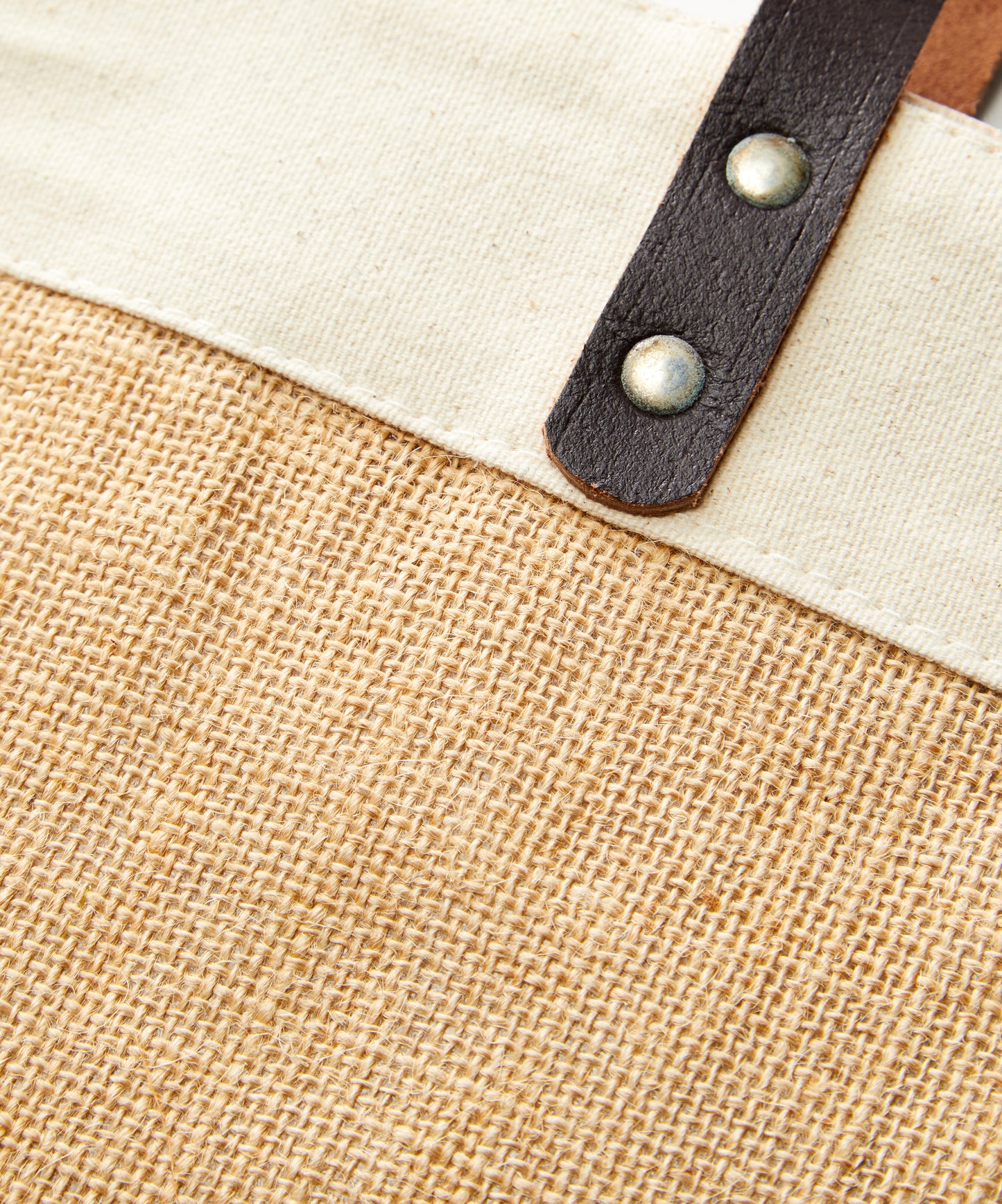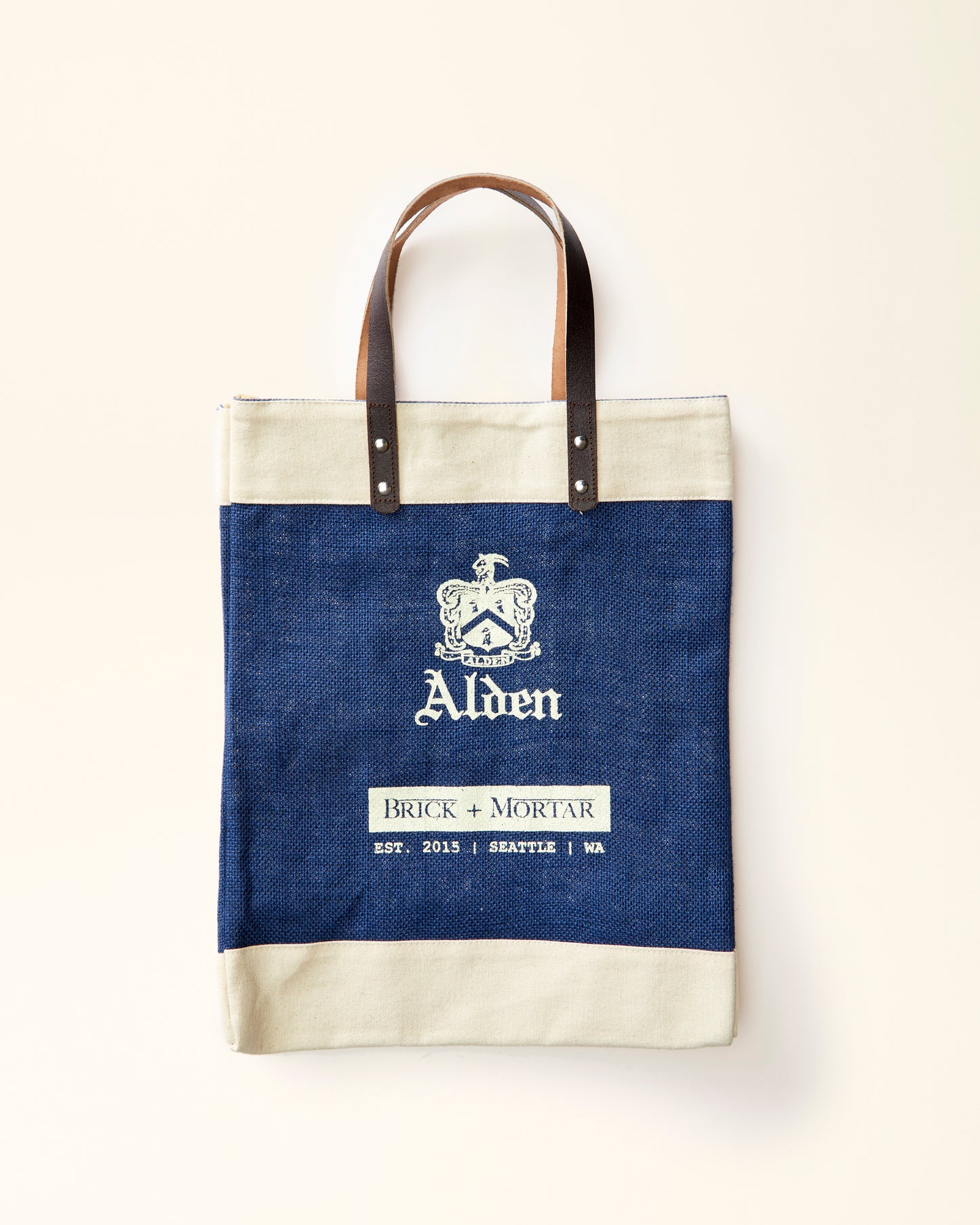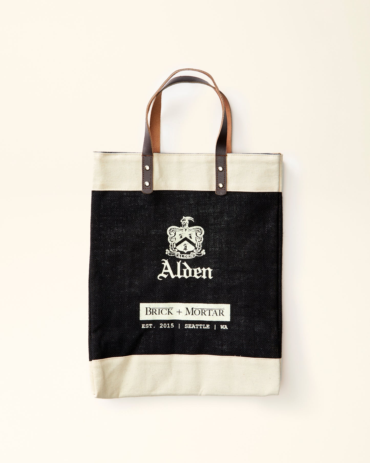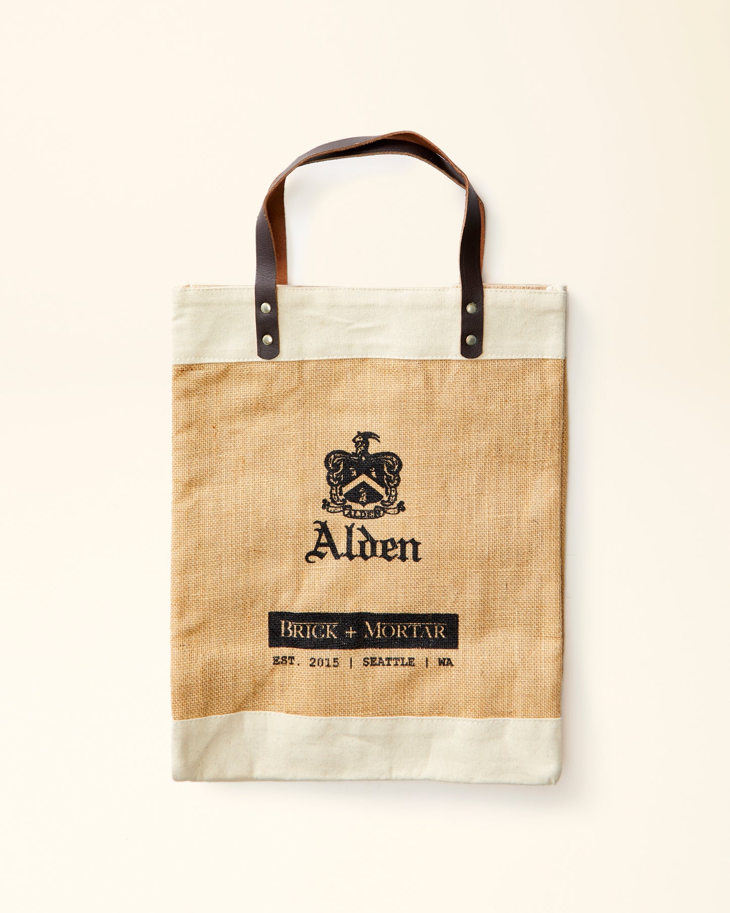 Made from 100% Jute which is strong, durable and protected with a waterproof liner. Built for the Seattle climate, you can drop this in a puddle and not worry about getting what's inside wet. Sturdy leather handles are stitched and riveted in order to bare a lot of weight and not break down. A large compartment means it can be perfect for your daily necessities but also becomes a perfect travel tote, being able to fit more than you expected. Printed with our graphic on the front and available in 3 colors, Black, Natural and Blue.
